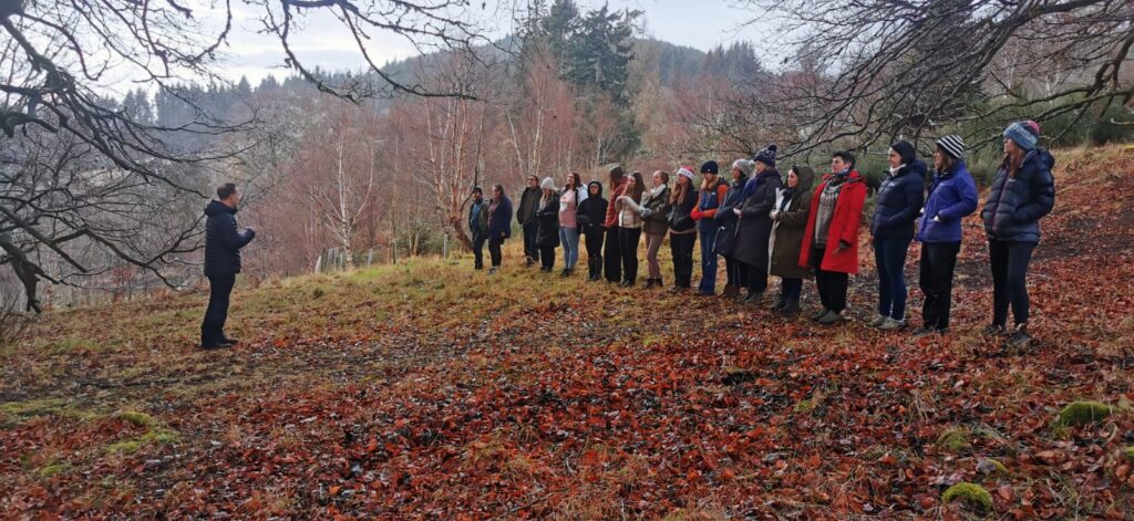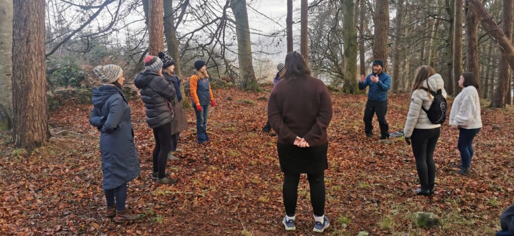 The day began at New Craigs Hospital, before we made our way up into Craig Dunain Community Woods. A small group of us – myself, members of the Nature4Health team, and some brilliant Child & Adolescent Mental Health Services (CAMHS) volunteers – headed up early in the morning with head torches to prepare the space and get a fire going. By the time the rest of the group arrived, the woods were glowing with warmth and welcome, setting a beautiful tone for the day.